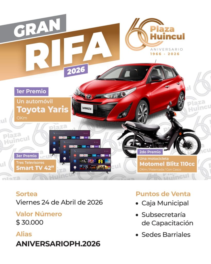 Plaza Huincul lanza la rifa por su 60° aniversario: sortearán un auto 0 KM y múltiples premios 19 febrero, 2026 10:02