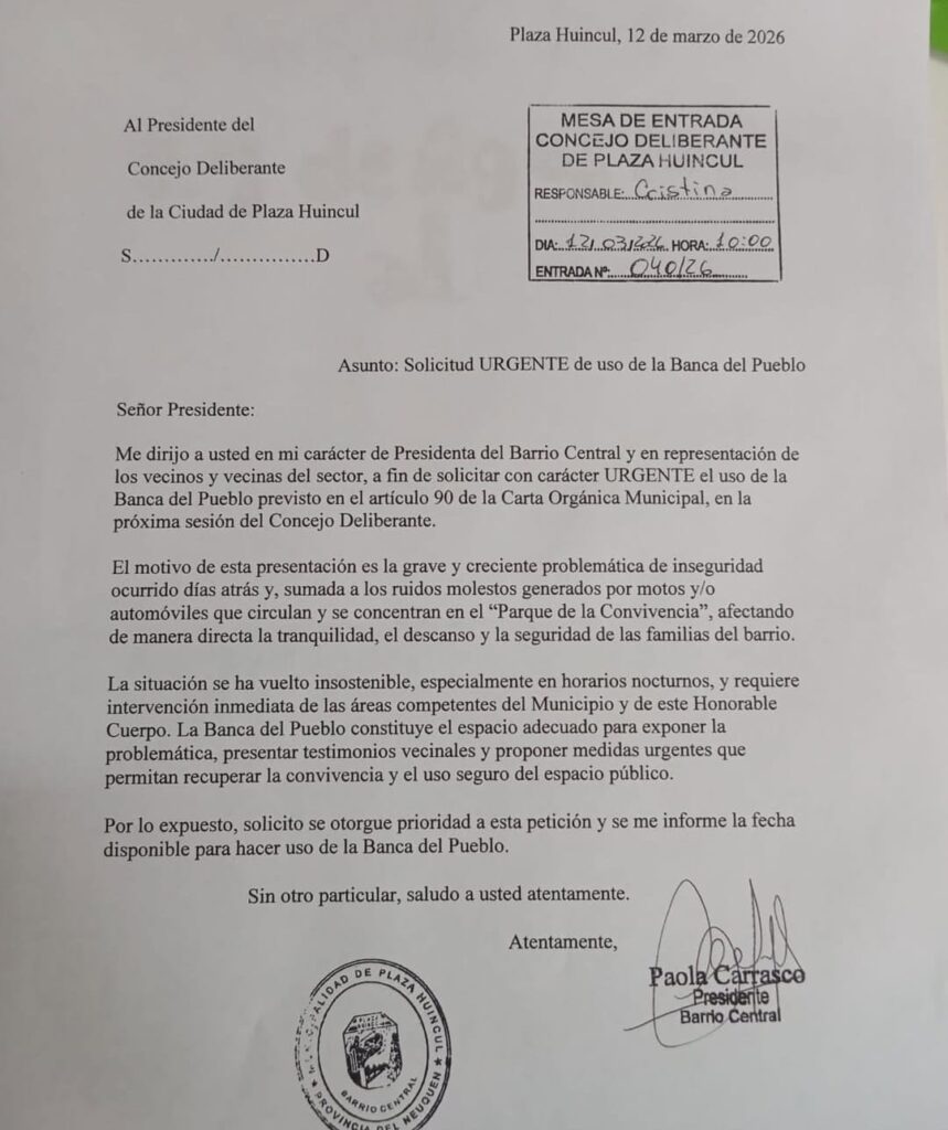 La comisión vecinal del barrio Central de Plaza Huincul solicitó formalmente la banca del pueblo en el Concejo Deliberante para exponer la preocupación de los vecinos ante los reiterados hechos de inseguridad registrados en el Parque de la Convivencia.